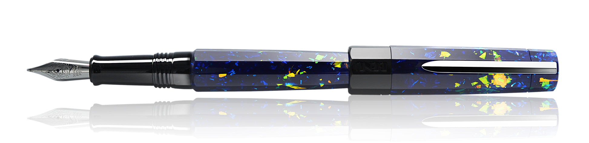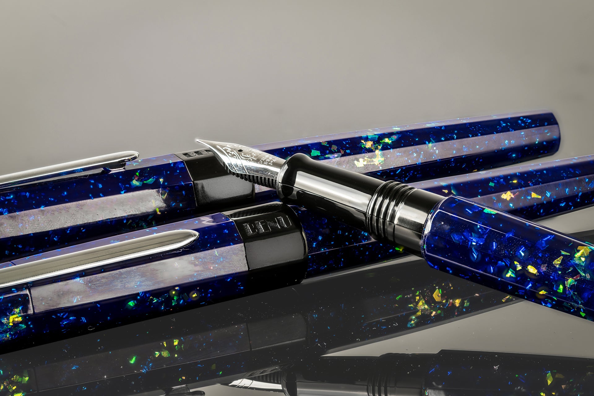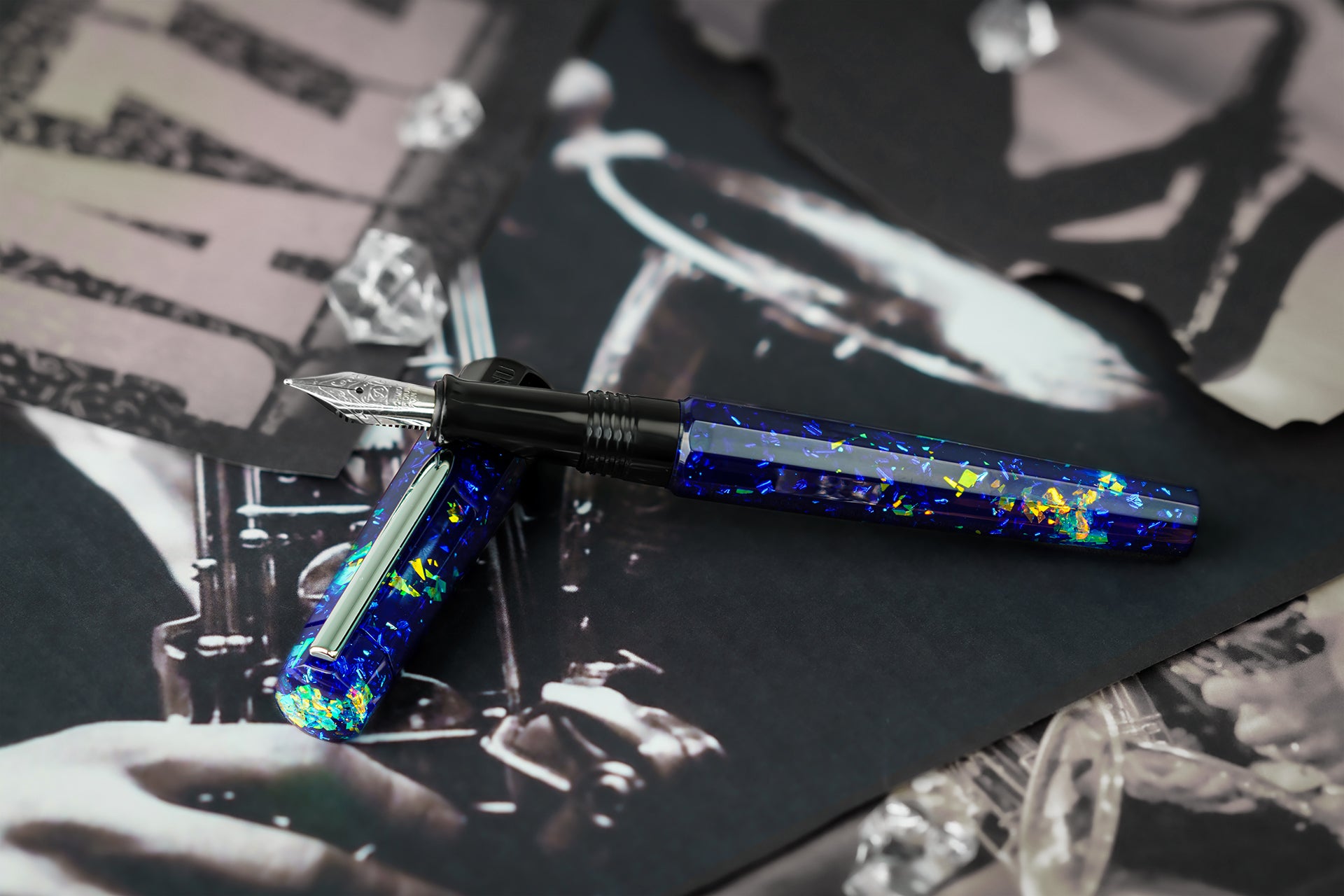 “Jazz” loves inky blue-blacks, cool greys, and even orange (think Rohrer & Klinger's Helianthus fountain pen ink) for a slightly 1980s vibe—tones that echo the palette and let the shimmer improvise. On bright white paper, it’s a spotlight moment; on cream, it’s late-night velvet. If your desk needs a little saxophone-at-midnight energy, this is your fountain pen.