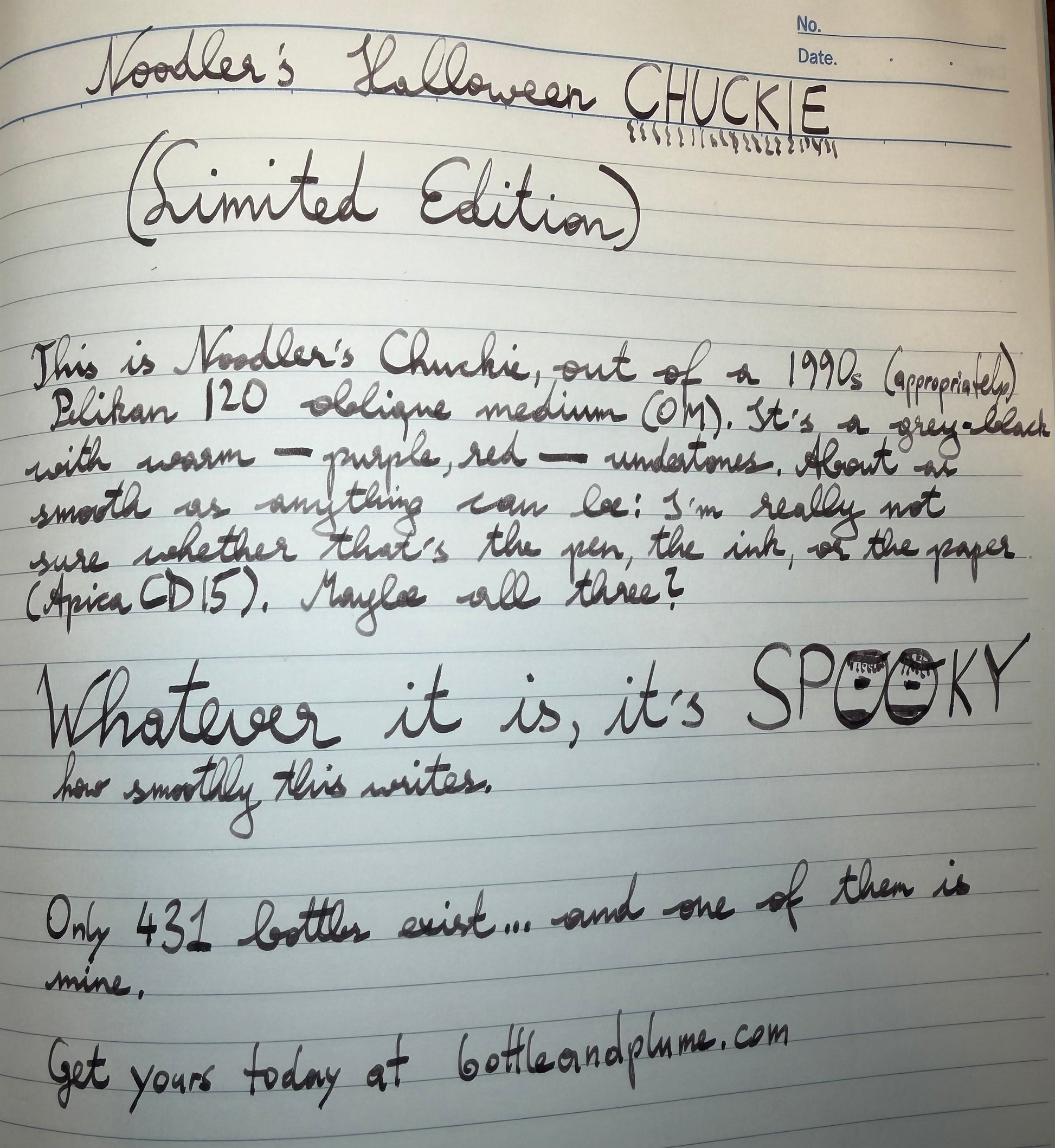 This year's Limited Edition Noodler's Halloween Ink is Chucky - a deep, spooky black. Only 431 bottles exist worldwide; grab yours before they run out.