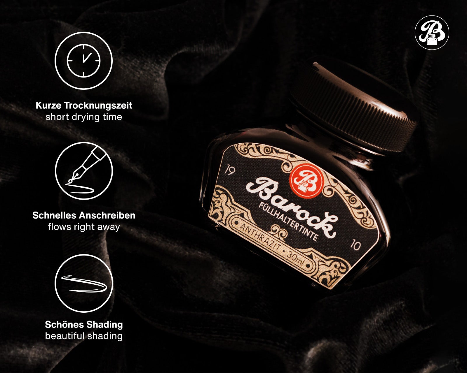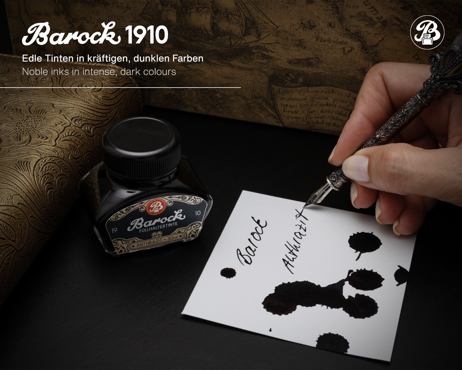 We are proud to be able to continue this legacy now under the brand name "Barock". The new Barock ink collections complement our classic writing ink range with expressive, well-saturated inks for fountain pens, glass pens and rollerballs. Barock inks are fountain pen inks of the highest quality, combining the tradition of the past with modern writing characteristics. With their excellent ink flow, instant writing and beautiful shading, they offer you a first-class writing experience.