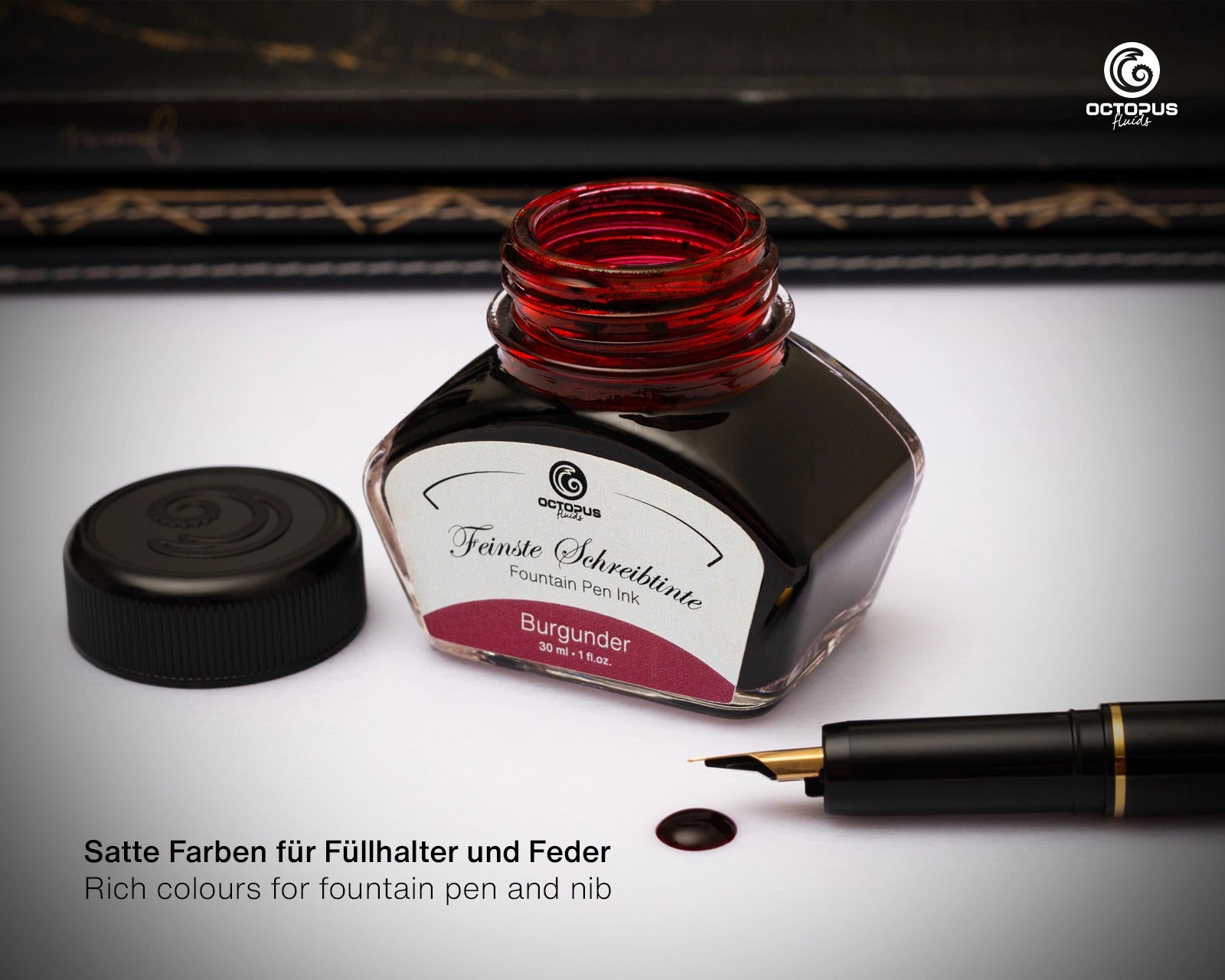 Octopus Fluids Burgundy fountain pen ink delivers a deep, elegant shade of red with refined character. Balanced between classic wine tones and professional sophistication, this ink writes smoothly and dries with rich saturation that works beautifully for journaling, note-taking, or correspondence. Made in Germany, Octopus Fluids inks are water-soluble, easy to clean, and safe for daily use in any modern fountain pen.