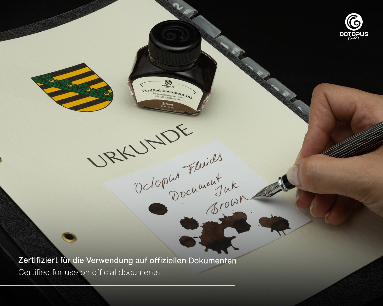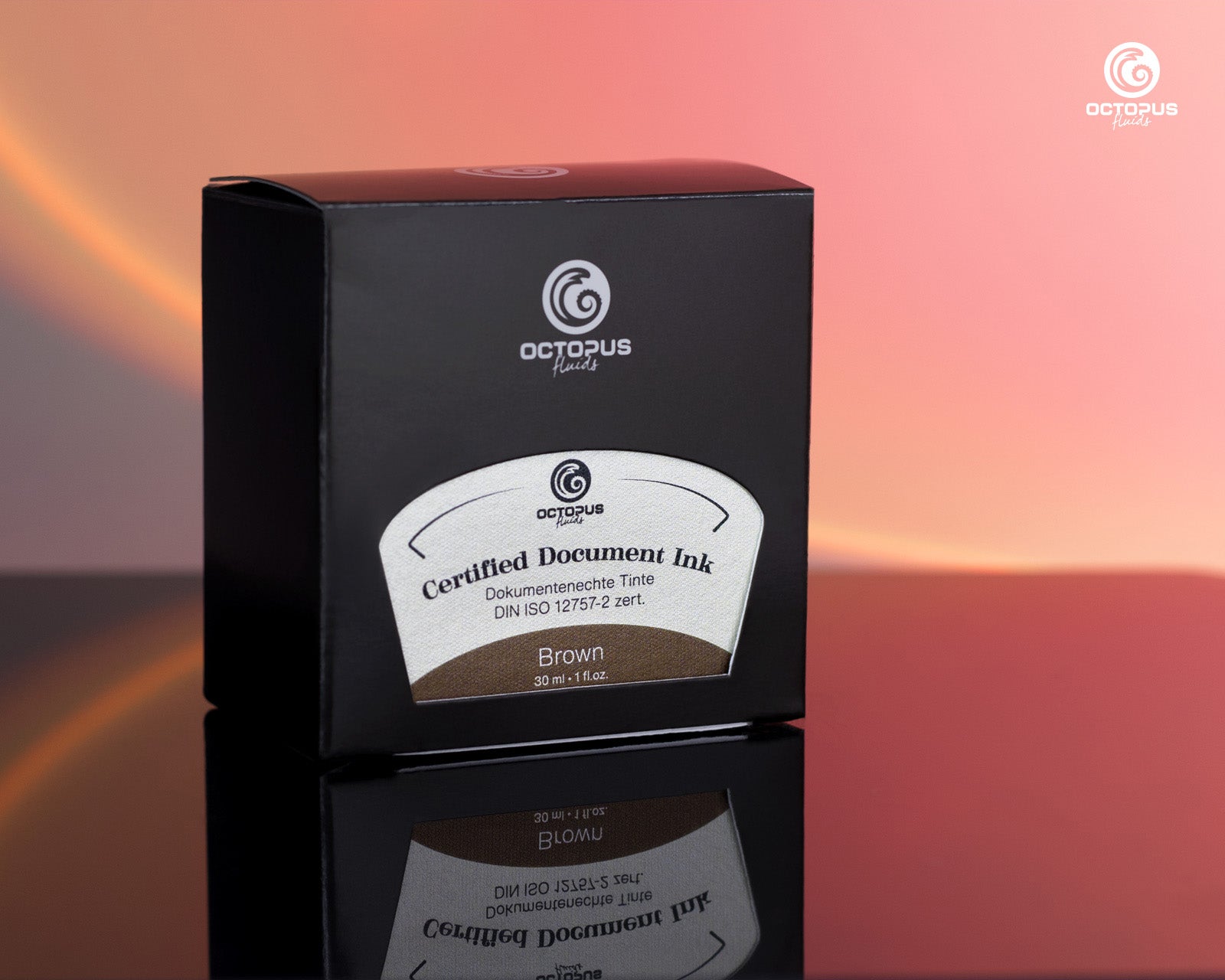 This is Octopus Fluids' Brown document ink: a DIN ISO-12757-2 certified document ink that has withstood tortures (water, UV exposure, bleach, other common chemicals used for forgery) that would make other inks blush. Or fade.
