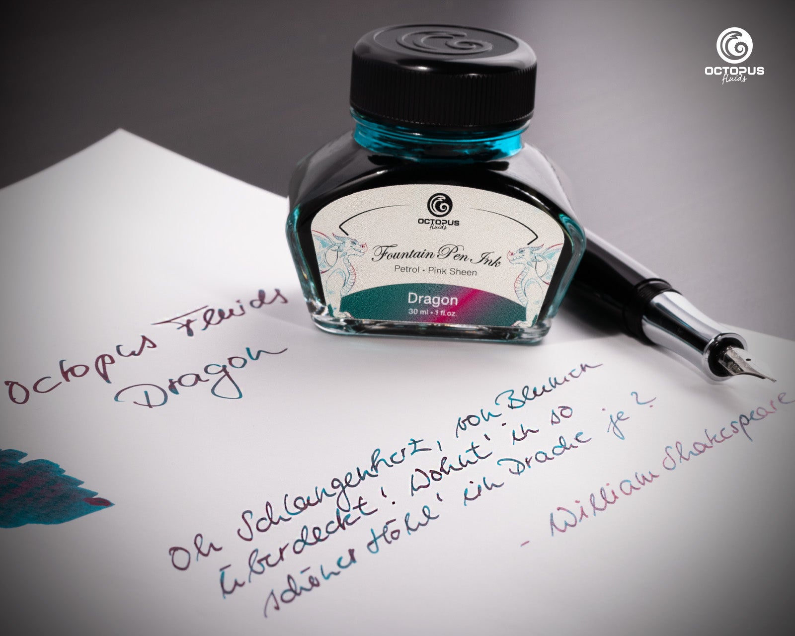 A 30mL bottle of Octopus’s Dragon (petrol) fountain pen ink, with a stunning multi-color sheening effect.