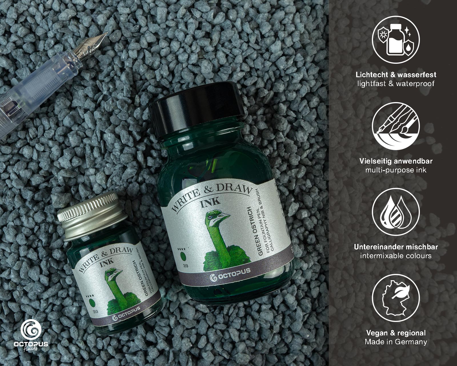To ensure trouble-free use in fountain pens, avoid letting pigment inks like Octopus Write and Draw dry out in your pen.