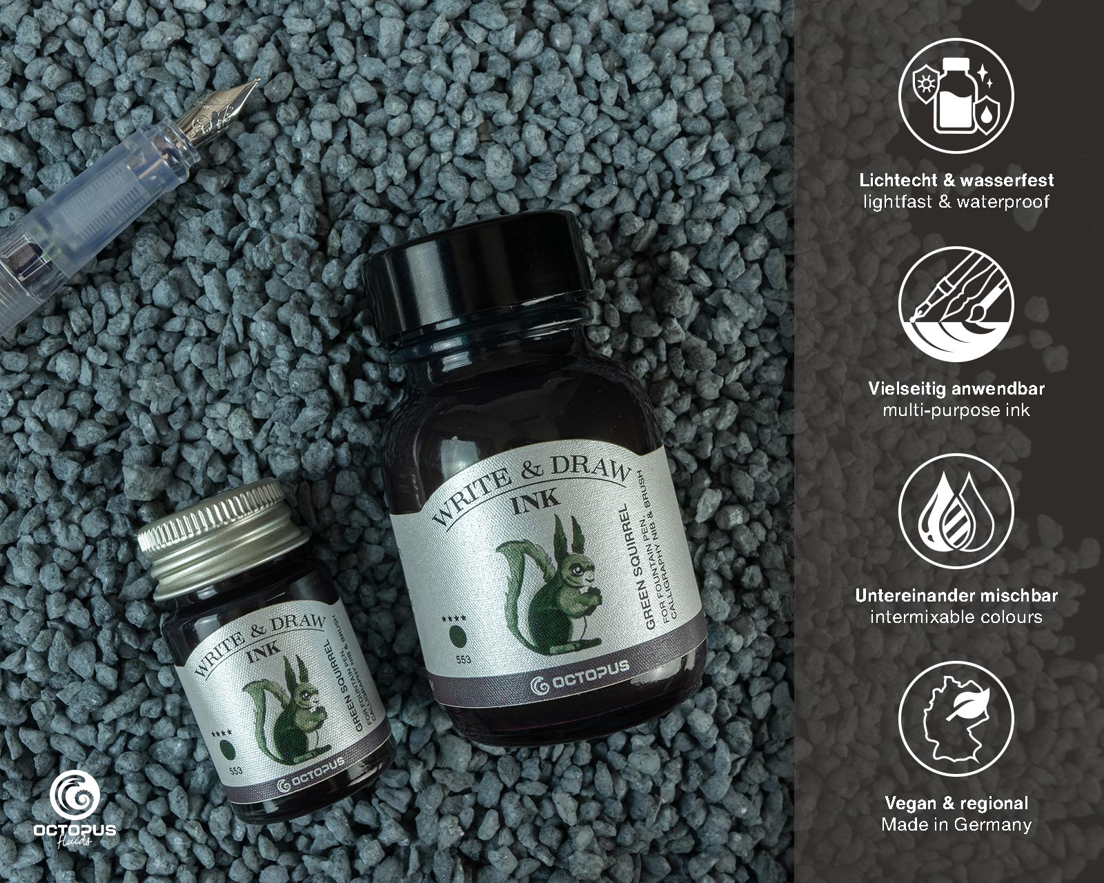 To ensure trouble-free use in fountain pens, avoid letting pigment inks like Octopus Write and Draw dry out in your pen.