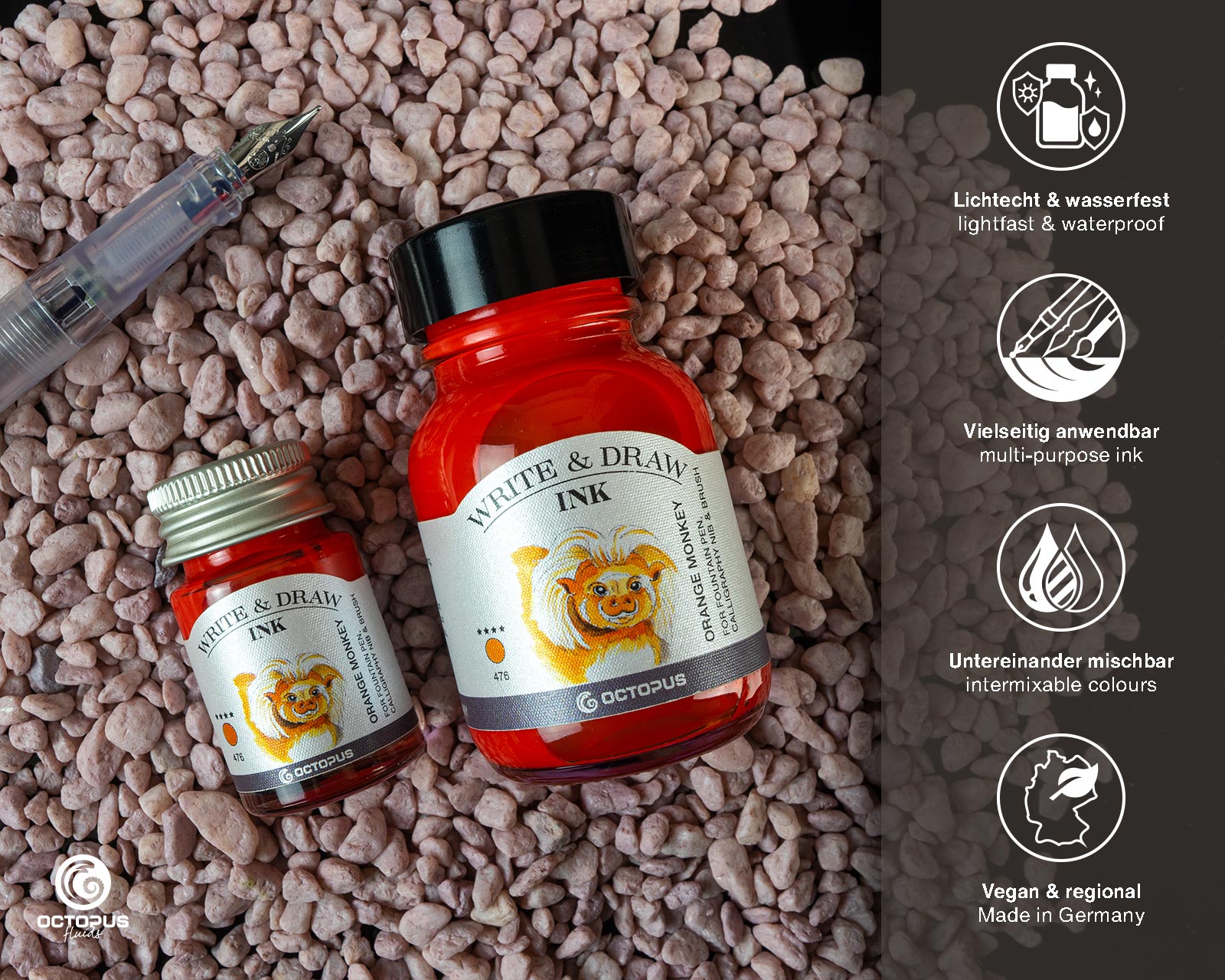 To ensure trouble-free use in fountain pens, avoid letting pigment inks like Octopus Write and Draw dry out in your pen.