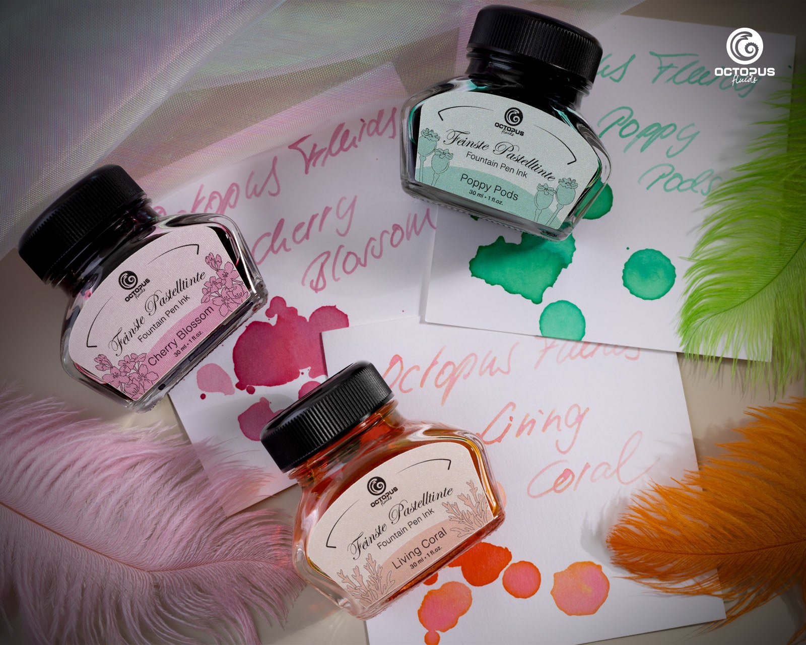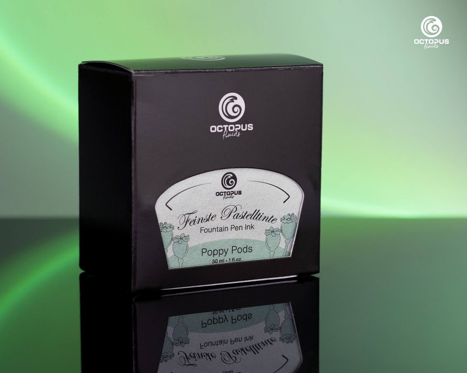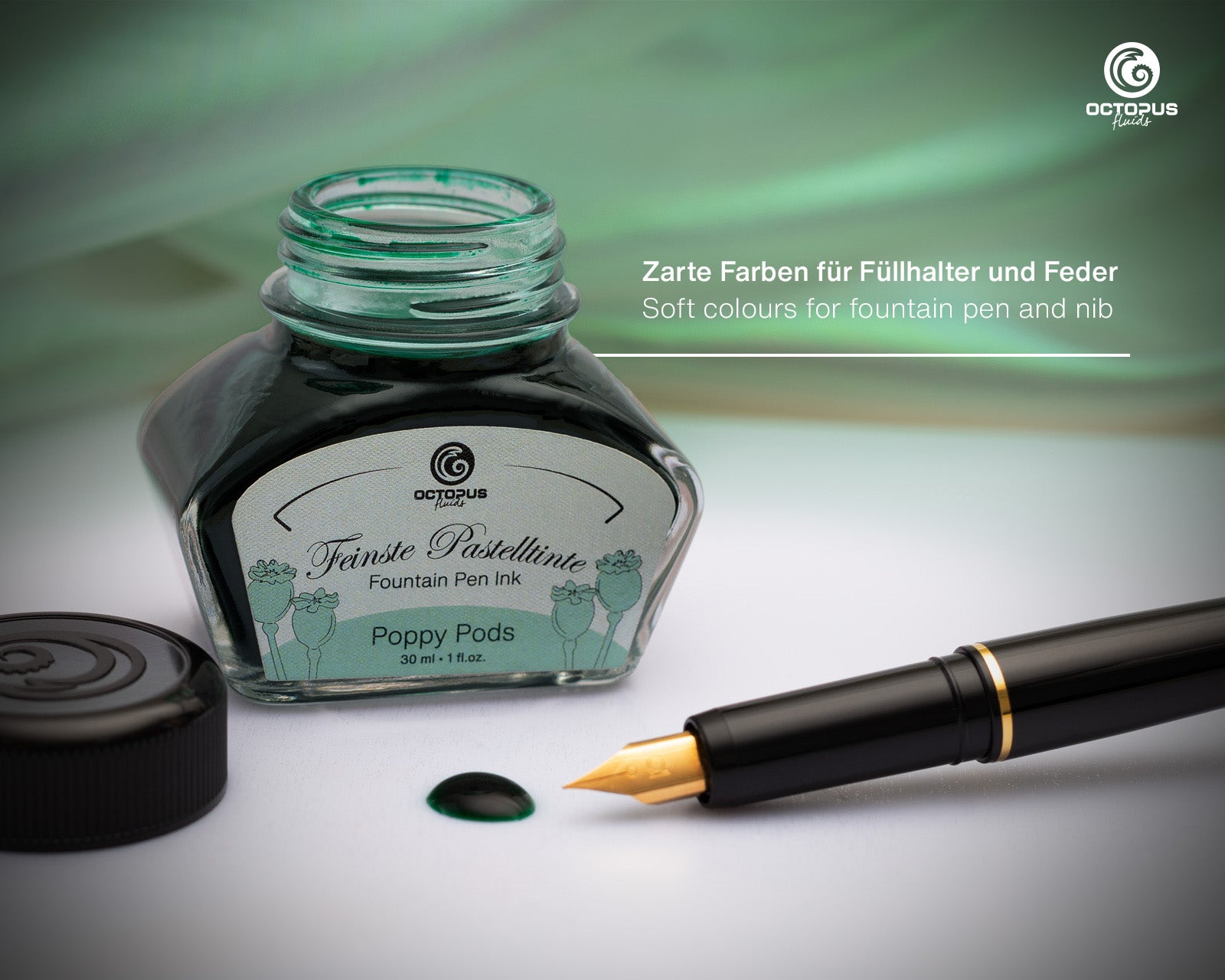Octopus’s light green “Poppy Pods” fountain pen ink. Dye-based, with some shading.