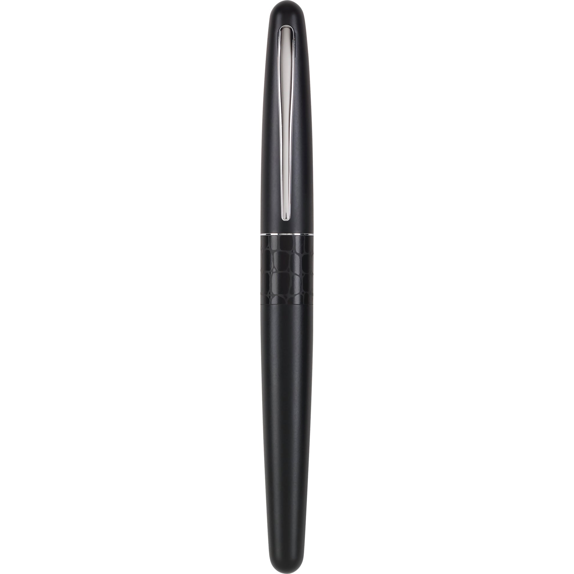 This is the Crocodile colorway from Pilot Metropolitan's "Animal Collection." It's a black Pilot Metro fountain pen with a black crocodile-skin pattern on the section.