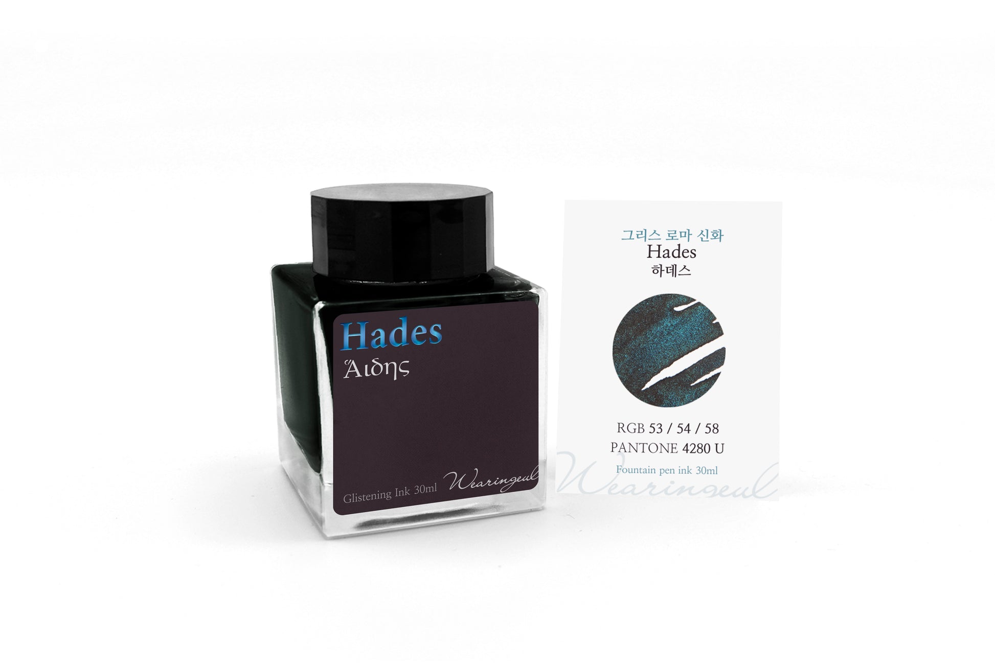 Hades is a fountain pen ink that features a near-black base with icy blue glitter, giving it dramatic sparkle.