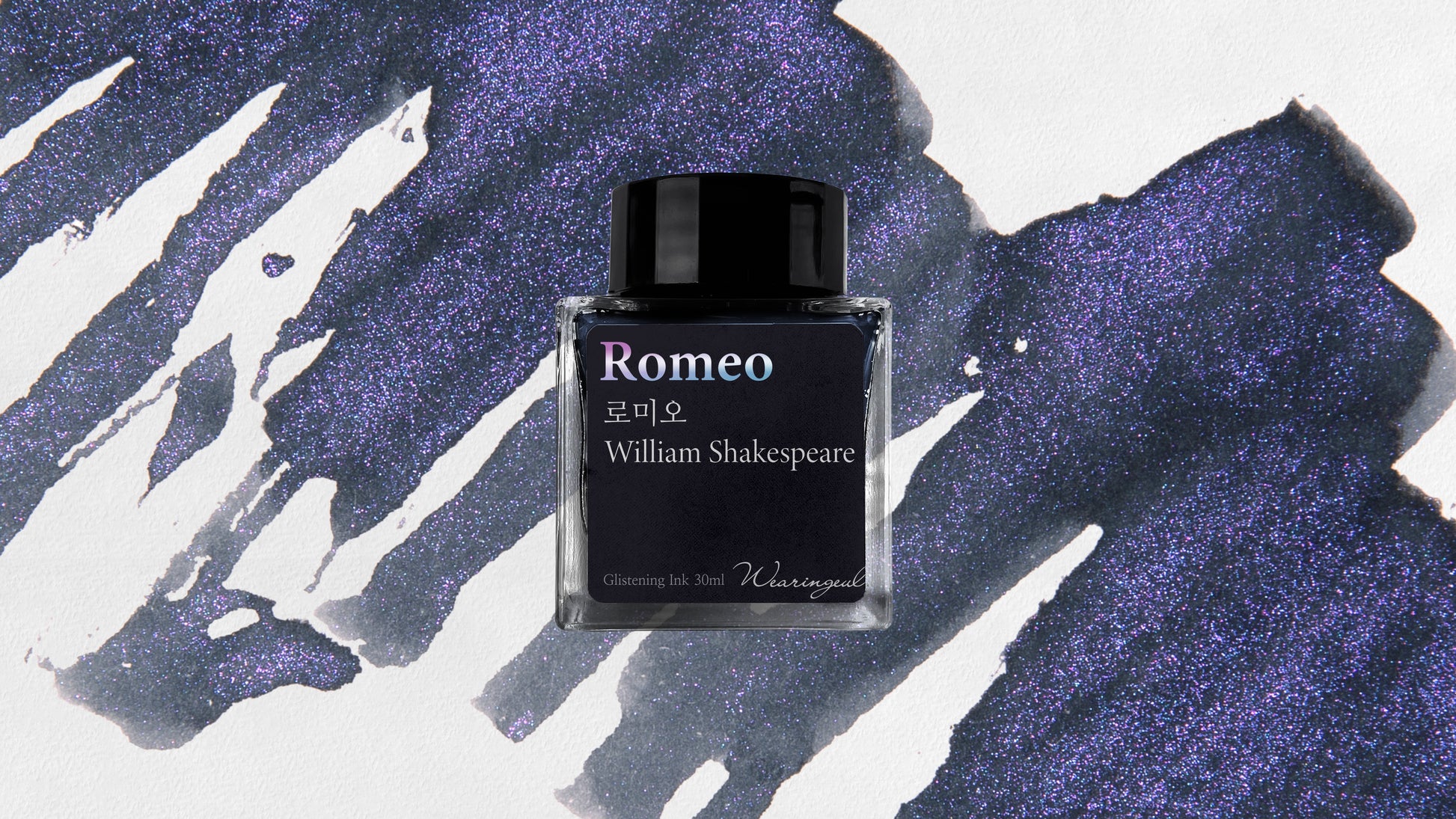 Wearingeul's Romeo (William Shakespeare - Romeo and Juliet) is a purple-black fountain pen ink with strong shading and purple shimmer.